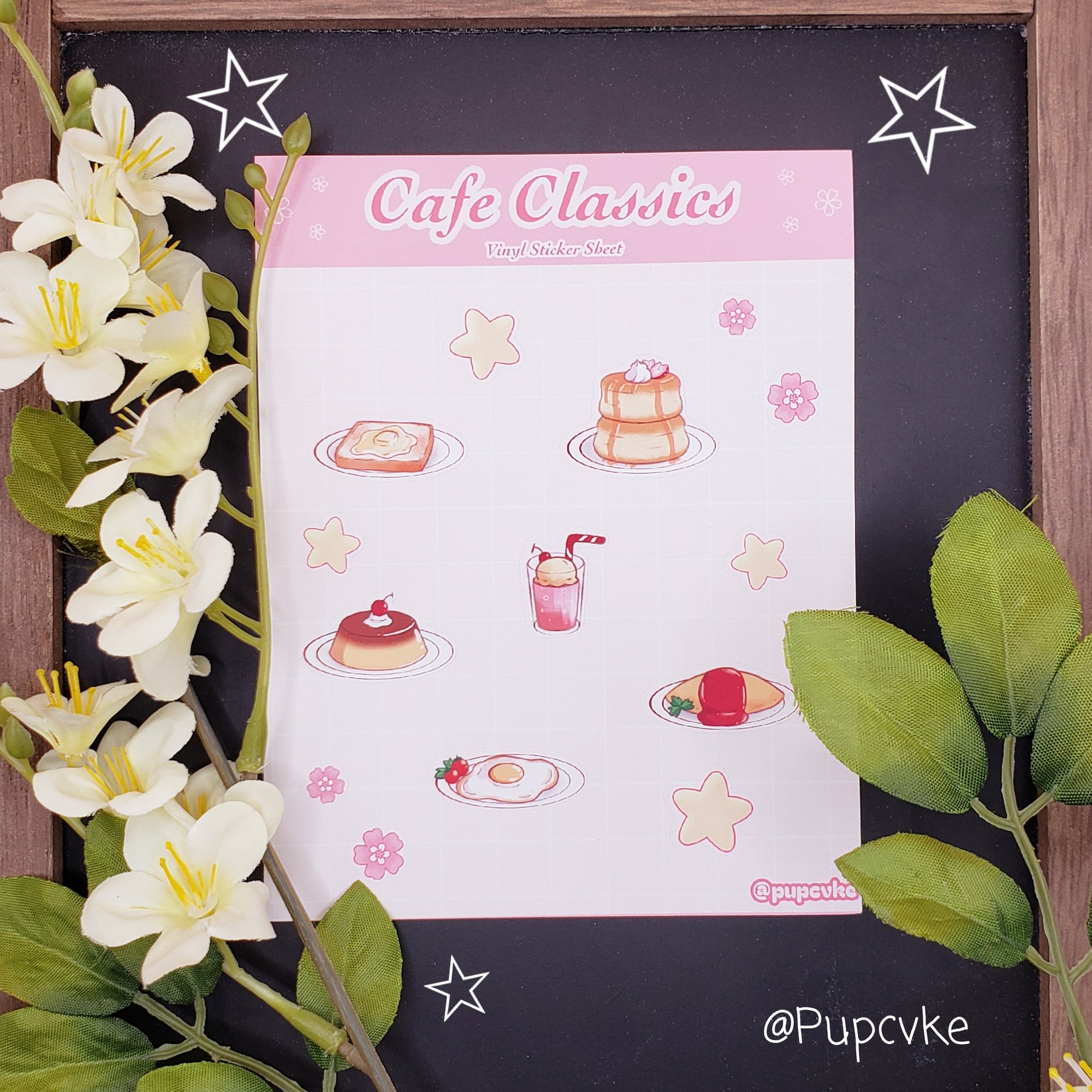All your cafe classic favorites now on one delightful sticker sheet! Jiggly flan and fluffy souffle pancakes accompanied by additional deco stickers to make your journaling a treat for the eyes.